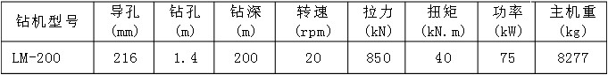 (4)鉆具 鉆具包括φ216mm導孔鉆頭、φ1.4m擴孔鉆頭、φ2.0m擴孔鉆頭(因為φ2.0m擴孔鉆頭比φ1.4m鉆頭一邊只大30cm,且鉆頭較重、鉆進速度較慢,所以一般不采用。)、鉆桿(開孔鉆桿、穩(wěn)定鉆桿和普通鉆桿)等。在斜井施工中,為減少阻力,使用φ1.4m擴孔鉆頭更為有效。 3.3 施工技術參數(shù) (1)我局豎井、斜井施工設備選取的反井鉆機機型為LM-200型。詳細參數(shù)見表3-1、表3-2。