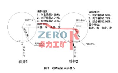 在完成的兩條斜井中,第一條最終實(shí)際透孔位置較設(shè)計(jì)透孔中心向下偏斜2.O4m,向右偏斜0.98m,綜合偏斜2.26m,鉆孔長(zhǎng)度212.62m,綜合偏斜率1.06%;第二條最終實(shí)際透孔位置較設(shè)計(jì)透孔透孔中心向下偏斜O(jiān).78m,向右偏斜O(jiān).6Om,綜合偏斜0.98m,鉆孔長(zhǎng)度212.76m,綜合偏斜率0.46%.兩條斜并在鉆孔較深、巖層較硬的條件下,偏斜度的控制均取得了良好的效果。透孔具體情況見(jiàn)圖3。